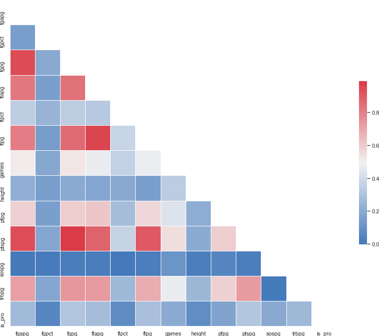 The goal for this project was to create a model for using player stats to predict the likelihood of a player being drafted to the professional league. The first task was finding data, lots of data. This was acquired by web-scraping data from the site Sports Reference at Sports Reference.com. Historical and current NCAA player statistics were pulled into a dataframe comprised of both drafted and undrafted players. Players were assigned a binary status of 0 for those who did not play professioanlly and 1 for those who played in a professional league. This provided a big data source to reduce our chances of an overfit model. Data was then cleaned and pre-processed to prepare for model training. The following statistics were chosen as our features to train and test our model.