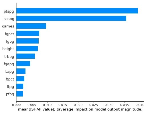 For a Random distribution we randomly split our model in half making one half a train dataset and one half a test data set. The train dataset was then split into random test train subsets. We then modeled and trained our data to identify feature strengths. The Correlation and Heatmap showed correlation between strength of schedule and field goal percent. Strength of schedule showed to be a key feature in all modules. The SHAP representation also showed points per game to have a strong importance. After assessing models we chose a Random Forest Classifier (RFC) model for training our data and testing our predictions. With the RFC model we were able to generate the relative feature importance among the player statistics. The flexibility of the RFC also allowed us to ulitlize several features while maintaining accuracy.
